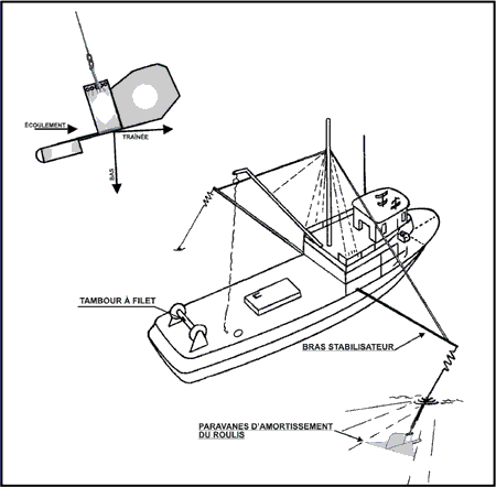 Comme bon nombre de petits bâtiments de pêche de la côte ouest, le Lori Cathlynn est muni de paravanes stabilisateurs. Accroché à une perche articulée dans le plan vertical (bras stabilisateur) au milieu du bateau, chaque paravane stabilisateur est composé d'un aileron métallique triangulaire auquel est attaché un bout de chaîne d'environ 2 m qui est suspendu au bout du bras stabilisateur par un cordage en nylon tressé. Le cordage est fixé au bout du bras stabilisateur, et la cosse à son extrémité est maniée à la chaîne attachée au paravane (voir Figure 2).