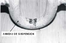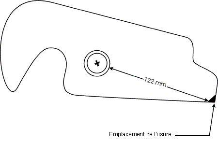 flasques (voir la photo 20). Les crocs, conçus pour avoir une charge maximum pratique de 2,5 tonnes, comportent une distance minimale de 122 mm entre l'extrémité des surfaces transmetteuses de charge et la circonférence de leur pivot. Lorsque cette distance n'est plus respectée, le fabricant recommande de remplacer le croc, le levier de blocage et la base. Sur le croc avant de l'embarcation, cette distance était de 122,6 mm, ce qui est conforme à la norme technique. Sur le croc arrière cependant, la distance moyenne n'était que de 121,8 mm (voir la figure 7).