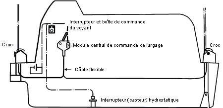 Un pressostat est installé sur la quille de l'embarcation de sauvetage. Ce dispositif détermine si l'embarcation de sauvetage est dans l'eau ou hors de l'eau et il transmet le signal électrique correspondant à la bobine de solénoïde placée sur le levier d'interdiction. Essentiellement, le pressostat est composé d'un diaphragme qui fléchit sous l'influence de la pression hydrostatique, ce qui établit ou coupe un contact électrique, lequel à son tour met sous tension ou hors tension le solénoïde. La chambre au-dessus du diaphragme est maintenue à la pression atmosphérique au moyen d'un évent compensateur.