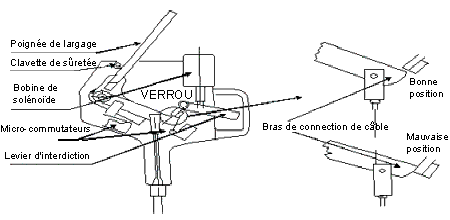 Le module central de commande de largage renferme trois micro-commutateurs : deux font contact avec les deux bras de connexion de câble, tandis que le troisième se trouve sous le levier d'interdiction avec lequel il vient en contact. Les micro-commutateurs sont utilisés pour témoigner des diverses conditions de fonctionnement sur le panneau de commande et d'avertisseurs électriques (voir la rubrique 1.1.8).