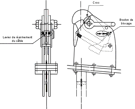 Sur chaque dispositif, le croc, le levier de blocage et le levier de réenclenchement portent des marques repères. Le croc a été correctement réenclenché lorsque ces marques sont bien alignées.