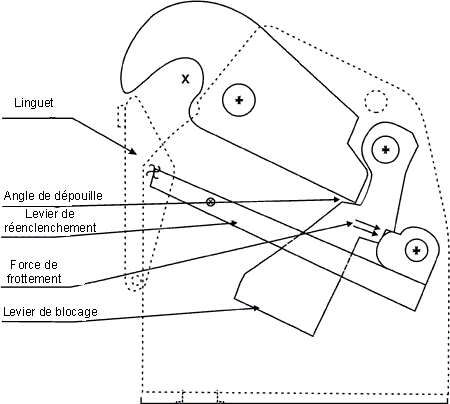 Lorsque le dispositif supporte une charge ou est en mode de réenclenchement (voir la photo 10), l'extrémité plate du croc s'appuie contre le levier de blocage et lui transmet une charge, repoussant celui-ci contre une sorte de pêne sur le levier de réenclenchement. Lorsque sa surface touche le croc, le levier de blocage a un angle de dépouille de 18°.