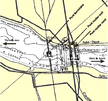 Un navire descendant passe d'abord sous la section nord du pont routier, puis sous la section sud, après quoi il passe sous le pont ferroviaire.