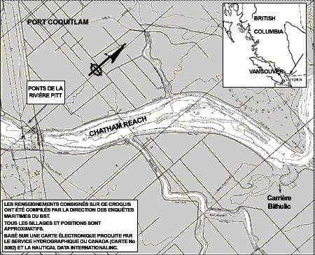 Il y a trois ponts qui enjambent la rivière Pitt à Chatham Reach (Colombie-Britannique). Le pont ferroviaire de la rivière Pitt est exploité par le Chemin de fer Canadien Pacifique (CP). À quelque 305 m plus au nord, on trouve le pont routier de la rivière Pitt, dont le fonctionnement est assuré par le ministère des Transports de la provinceNote de bas de page 2. Le pont routier consiste en deux travées espacées de 76 m qui forment une partie de la route Lougheed reliant la ville de Port Coquitlam à la municipalité de Pitt Meadows (Colombie-Britannique) (voir l'annexe A).