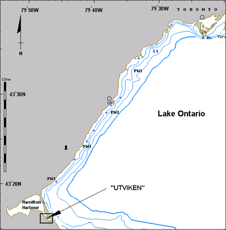 Le Utviken arrive au mouillage du port de Hamilton à 11 h le 30 mars 2001. À 11 h 36 le 1er avril 2001, un pilote monte à bord du Utviken afin de conduire le navire jusqu'à la jetée 23 du port de Hamilton. On lui remet une fiche de pilotage et il s'ensuit un bref échange d'information avec le capitaine concernant le déplacement du navire du mouillage jusqu'à la jetée 23. Le pilote a déjà conduit ce navire au même poste d'amarrage l'année précédente.
