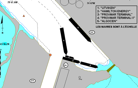 La jetée 24 a été attribuée par l'Administration portuaire de Hamilton (APH) à Provmar Fuels Inc. Elle commence à l'extrémité nord-ouest de la jetée et s'étend en direction sud-est sur plusieurs centaines de mètres. C'est à cet endroit que sont amarrés en permanence les barges de stockage Provmar Terminal et Provmar Terminal II, de même que le navire ravitailleur Hamilton Energy. Cet emplacement n'est pas sans risque; c'est le second heurt violent grave à survenir à ces navires depuis 1993.