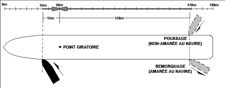 Le point giratoire d'un bâtiment au repos se trouve à peu près au milieu du navire. Lorsque ce même navire a de l'erre en avant, le point giratoire se déplace vers un point situé au quart de la longueur du bâtiment à partir de l'avantNote de bas de page 5. Il faut donc tenir compte du fait que le levier de rotation du remorqueur avant qui assiste un navire qui a de l'erre est réduit, alors que celui du remorqueur arrière est amplifié.