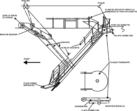 Les garants sont passés dans des poulies à gorge retenues à un bras de bossoir dont une extrémité articulée est fixée sur le pont. En passant par un autre système de poulies à gorge et de moufles mobiles fixées à des colonnes de pont ou des colonnes latérales, les garants s'enroulent autour des tambours d'un treuil électrique. Pour retenir le tambour du treuil et donc l'échelle, à sa dernière position de blocage, le moteur électrique est muni d'un frein à disque électromagnétique. Un second frein, à fonctionnement manuel, devant servir en cas d'urgence lorsque le frein principal est défectueux, entoure aussi un des tambours du treuil.