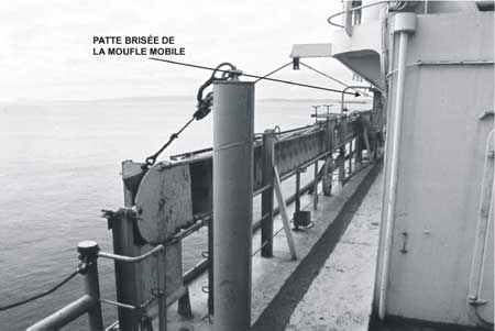 - La platine à oeil qui retenait la moufle mobile dans laquelle les garants étaient passés s'est rompue. La moufle mobile s'est échappée et a heurté violemment un membre de l'équipage au front qui a succombé à ses blessures.