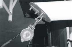 Des moufles mobiles se trouvent au-dessus et à l'intérieur de l'échelle, de sorte que toute traction additionnelle sur les garants a pour effet de faire tourner de côté l'échelle au complet ainsi que la plaque tournante. L'ensemble pivote alors autour de l'axe de rotation de la plaque tournante sur le pont jusqu'à ce qu'il soit à la verticale et repose sur le côté. On peut alors l'arrimer en vue de la traversée de l'océan. Quand elles sont arrimées, l'échelle et la plaque tournante sont à la verticale vers l'intérieur du navire, mais à l'extérieur des rambardes (voir la Figure 2).