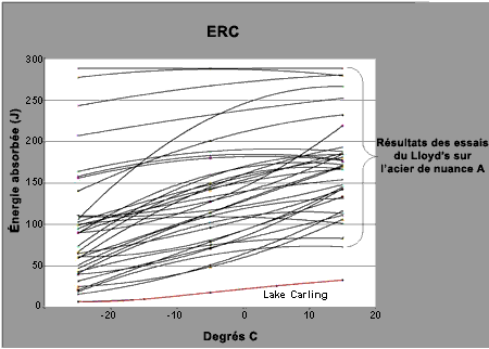 Lors d'un examen récent des propriétés de rupture de l'acier du Lloyd's Register de nuance A employé pour la construction de navires, le Lloyd's a constaté que sur un total de 39 éprouvettes provenant de différents aciéristes d'un peu partout dans le monde, l'ERC moyenne la plus basse enregistrée était de 49 J à 0 °C (sur une seule éprouvette) tandis que la valeur moyenne à cette température pour les 39 éprouvettes était bien plus élevée, soit 134 JNote de bas de page 12. Cinq éprouvettes, cependant, avaient des TTDF supérieures à 0 °C et quatre autres éprouvettes se situaient entre -6 et -1 °CNote de bas de page 13.