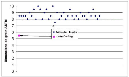 - The large grain size and low CVN impact energy of the Lake Carling's side shell plate resulted in a corresponding fracture toughness that is below expectations and does not permit a reasonable damage tolerance in all operational conditions.