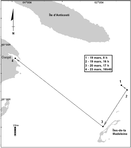 L'après-midi et la soirée du 18 mars ainsi que les premières heures du matin le 19 mars se passent sans incident. Le navire file environ 13,5 noeuds pendant la traversée du Golfe Saint-Laurent. Les vents sont généralement du nord ou du nord-est, de 10 à 20 noeuds. Vers 8 h, on ouvre le panneau de la cale no 4 pour une inspection de routine et le personnel du navire constate que de l'eau pénètre du côté bâbord de la cale. On en informe le capitaine. Le navire se trouve alors par 48°16′48″N et 061°21′30″W, environ 38 nm au nord des îles de la Madeleine (position 1, annexe C). Les vents sont de 20 noeuds, du nord, la température de l'air est de −6°C et la température de l'eau est près de 0°C. L'équipage ne consigne pas l'état de la mer, mais selon tous les témoignages, celui-ci n'a rien d'exceptionnel. Selon les calculs et les données historiques, la hauteur des vagues devait se situer entre 1,5 et 2,5 m avec une longueur d'onde de la houle de 56 m environ.