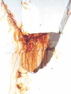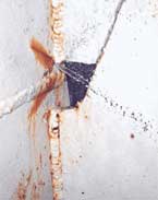 Dans la cale no 2, on a aussi repéré quatre fissures; aux membrures 171½ (photo 6) et 172½ à tribord, et aux membrures 144 et 145 à bâbord. Contrairement aux fissures trouvées dans la cale no 4, toutes les fissures de la cale no 2 avaient été couvertes de soudure superficielle. L'épaisseur de pénétration de la soudure dans le bordé ne dépassait pas quelques millimètres. Il a été impossible de savoir quand et par qui ces réparations avaient été faites, et les dossiers du DNV ne contiennent nulle mention, ni des fissures ni des réparations. Contrairement aux manifestations de fissures de la cale no 4, celles-ci ne se propageaient pas à l'avant et à l'arrière de la membrure; ainsi, la fissure de la membrure 171½ était limitée à l'avant de la membrure.