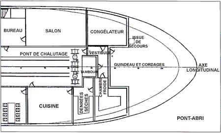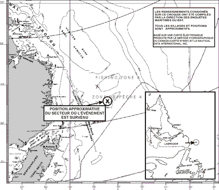 Le 11 mars 2002 à minuit, heure normale de Terre-Neuve (HNT)Note de bas de page 3, le Katsheshuk appareille de Harbour Grace (Terre-Neuve-et-Labrador) avec un équipage de 30 personnes à destination des lieux de pêche à la crevette situés au large de la côte est du Labrador (Annexe A). Arrivé sur les lieux, le bateau se met à pêcher mais il doit se déplacer pour trouver des crevettes. Le matin du 17 mars 2002, le bateau ne peut pas pêcher à cause du mauvais temps. Le bateau se dirige alors vers l'ouest-sud-ouest et s'engage dans la banquise. À midi, le navire s'arrête dans les glaces en attendant que les conditions s'améliorent. Vers 15 h 45, deux membres de l'équipage qui travaillent sur le pont voient de la fumée s'échapper de la porte G (Figure 2) de la superstructure du pont de chalutage qui donne accès au vestibule. Un des membres de l'équipage va aussitôt prévenir l'officier de quart tandis que l'autre entre dans les emménagements en bas pour avertir l'équipage.