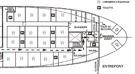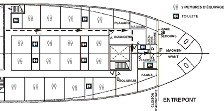 L'inspection initiale ayant révélé que la fumée provient de la partie avant du bateau, on ferme à distance les portes étanches à glissières par mesure de précaution. Tandis que le capitaine surveille la situation à partir de la timonerie, on se prépare, dans les emménagements de l'entrepont, trois ponts plus bas, à localiser et à combattre l'incendie.