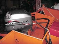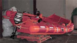 Le Katsheshuk avait à son bord un canot de sauvetage de 5,4 m, équipé d'un moteur hors-bord de 40 HP, qui faisait partie de l'équipement de sécurité du navireNote de bas de page 11. Il appert que la télécommande de barre du canot de sauvetage était défectueuse depuis la mi-janvier 2002. Pour pouvoir conduire le canot, on avait improvisé une allonge de barre (Photo 5) qu'on avait reliée au moteur hors-bord. À cause de ce dispositif de fortune, il fallait deux personnes pour conduire le canot; une pour le diriger et une autre pour actionner la commande des gaz.