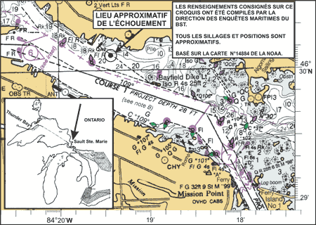 Alors que le navire approche de Mission Point, le capitaine observe deux bouées jaunes dans le chenal d'approche du quai de la Purvis Marine Limited. Ne sachant pas à quoi elles servent, le capitaine en parle au pilote qui lui répond que ces bouées ont été utilisées lors des travaux de dragage de l'année précédente. À 15 h 45, le navire s'échoue alors qu'il se présentait au quai sous un faible angle d'approche après avoir laissé sur bâbord la bouée la plus à l'est.