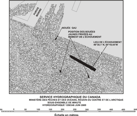 À peu près au même moment, un travailleur à la station de pompage située au bout du quai de la PML observe que le navire s'écarte des bouées jaunes et il signale la situation au personnel de la PML. La PML appelle le Emerald Star sur le radiotéléphone VHF pour lui dire de rester entre les bouées. Peu après l'appel, et avant que le capitaine ait le temps de faire un changement de cap, le navire s'échoue. Il est 15 h 45. L'échouement s'est produit à la position 46°30,1′N, 084° 19,44′W, à environ 1,4 encablure du quai mais à l'intérieur de la limite extérieure est du.chenal d'approche qui figure sur la carte no 14884 des États-Unis. Voir le croquis du secteur de l'accident à l'annexe A. La figure 1 montre la position à laquelle le navire s'est échoué par rapport aux bouées jaunes.