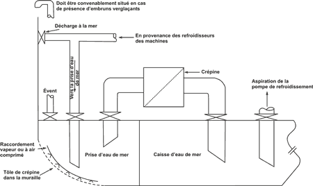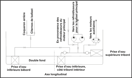 Le navire avait trois coffres de prise d'eau ventilés, dont chacun était muni à son sommet d'une soupape de ventilation à collerette. Toutefois, aucune conduite permanente d'arrivée de vapeur ou d'air ne leur était reliée. Les deux coffres de prise d'eau du côté tribord servaient à prélever de l'eau de mer pour refroidir la machine principale et les génératrices (Figure 2). La prise d'eau supérieure était située sur la muraille du navire, et la prise d'eau inférieure était située sur le fond du navire, au droit de l'axe longitudinal. Elles étaient toutes deux munies de crépines et de vannes d'isolement et elles étaient reliées à un tuyau commun. Le troisième coffre de prise d'eau était situé à bâbord et servait surtout aux opérations de ballastage. Le circuit permettait une interconnexion entre les trois prises d'eau.