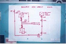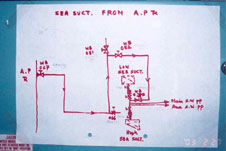Peu après, le navire jette l'ancre et on procède à l'inspection de son circuit de refroidissement. Un inspecteur de Transports Canada qui a embarqué avant la remise à flot entreprend l'inspection en examinant les deux crépines d'aspiration à la mer; il constate qu'elles sont toutes deux obstruées par de la glace. L'inspecteur consulte les plans du navire et avise le service machine des divers moyens à sa disposition pour refroidir les machines lorsque le navire navigue dans des eaux couvertes de glaces. Pour mieux informer le personnel, on affiche des croquis (Photos 2 et 3) à côté des panneaux de démarrage de la pompe de refroidissement principale et des pompes de refroidissement auxiliaires.