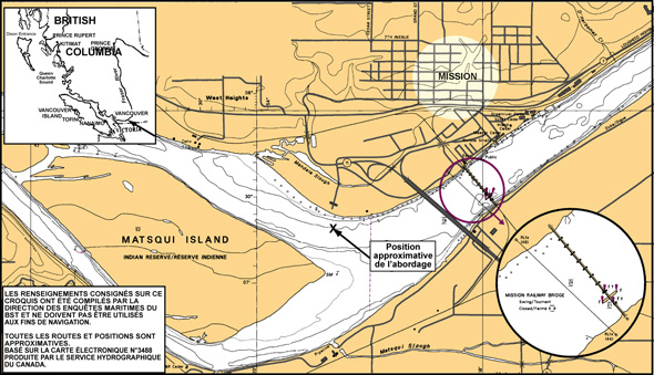 Deux ponts franchissent le fleuve Fraser à Mission : un pont des chemins de fer CP et, 500 m à l'ouest, le pont de la route 11. Le pont routier a une travée fixe avec un dégagement prescrit de 19 m. Le pont ferroviaire est plus bas; il est soutenu par 13 piliers de béton et est doté d'une travée pivotante, près de la rive sud, permettant le passage de navires à fort tirant d'air. Le trafic maritime ayant un faible tirant d'air, comme le Tiger Shaman et le Packmore 4000, empruntent le chenal sous la travée fixe du pont ferroviaire entre les piliers 5 et 6 depuis la rive nord.