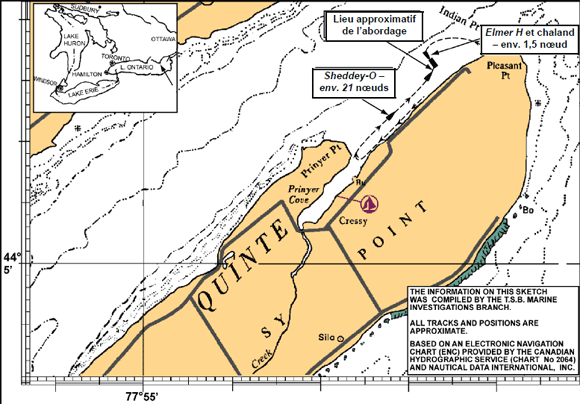 Le conducteur du Sheddey-O tente alors de virer sur tribord au dernier moment, mais à 21 h 25, l'avant du bâtiment heurte le côté tribord du chaland à un angle d'environ 90 degrés, à la position approximative de 44°06′47″N par 076°51′12″ W (voir la figure 1). Les trois personnes sur le pont avant du Sheddey-O sont projetées vers l'avant par l'impact; deux tombent sur le chaland et la troisième tombe d'abord sur le chaland puis à l'eau sur son côté bâbord. Le vêtement de flottaison individuelle de cette personne s'accroche sur la paroi inférieure du chaland avançant lentement. Le conducteur de l'Elmer H arrête les moteurs et plonge à l'eau pour la secourir.