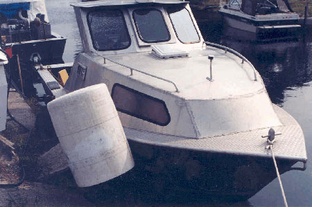 L'embarcation de plaisance était faite d'aluminium etétait d'une conception générale semblable à celle dubateau de travail. Le poste de conduite était situé àtribord derrière une petite cabine du capitaine. Un toitamovible en toile s'étendait à l'arrière du poste decommande (voir la photo 3).