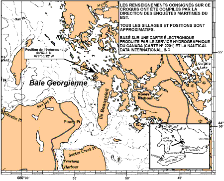 Le bateau a chaviré par 44°53,5′N et 079°53,12′W dans 5,5 m d'eau. Personne ne portait de gilet de sauvetage. En raison de l'exiguïté de la timonerie, il était difficile pour les personnes de s'en échapper par la porte tribord ou bâbord. Une fois sorties de la timonerie, certaines d'entre elles ont réussi à retirer leurs bottes de travail. Deux personnes ont nagé jusqu'au quai. Une personne a grimpé sur la coque retournée et y est demeurée jusqu'à ce que le bateau dérive plus près du rivage. On l'a alors aidée à rejoindre le rivage. Le membre d'équipage a brièvement lutté pour s'en sortir, mais a ensuite disparu sous la surface de l'eau à 1,5 m tout au plus du quai. Il a fallu environ trois minutes à partir du chavirement pour que les trois survivants arrivent à terre. Ils sont entrés dans un chalet à proximité et ont téléphoné au service 9-1-1.