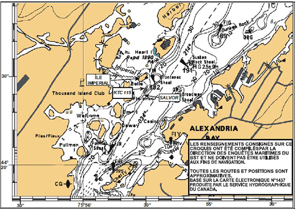 Conformément à la réglementation de la Voie maritimeNote de bas de page 3, le Salvor était doté d'un système d'identification automatique (SIA) qui transmet des données comme la vitesse du navire, sa position et son identité à la fois au contrôle du trafic de la Voie maritime et aux autres navires dans les environs. Comme l'ensemble Salvor / KTC 115 sortait du passage American immédiatement à l'ouest d'Alexandria Bay, le Thalassa Desgagnés remontait le fleuve dans sa direction, environ 1 km à l'est.