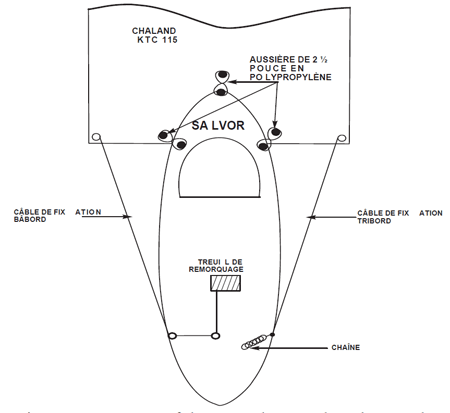 Le dispositif de remorquage comprenait une encoche dans le tableau arrière du chaland qui accueillait l'avant du remorqueur (voir la photo 1). Le dispositif de fixation comprenait une aussière de 2½ po en polypropylène tressé menant de l'avant du remorqueur à une bitte sur le chaland et des aussières semblables, une de chaque coin de l'encoche du chaland jusqu'à l'épaule respectivement bâbord et tribord du remorqueur (voir la figure 2). Pour faciliter la gouverne et la marche arrière, des câbles de fixation 6 × 36 de 1¾ po de diamètre étaient tendus entre les bittes sur la hanche du chaland et le pont arrière du remorqueur. Le câble de tribord était retenu par une manille à une chaîne à maillons d'acier de 2 po, qui était elle-même manillée à un chaumard sur le pont du remorqueur. Le câble de fixation bâbord menait par un chaumard au treuil de remorquage du remorqueur, qui servait à maintenir le remorqueur dans l'encoche.