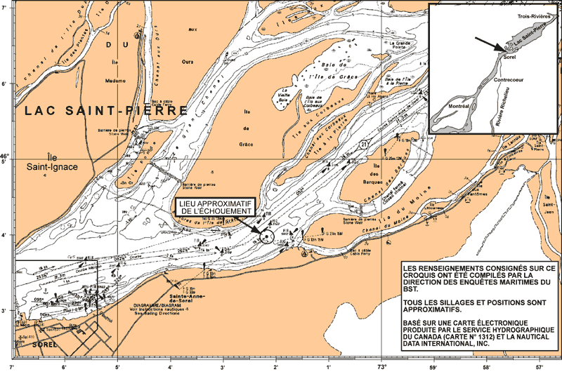 Peu après que le navire a dépassé la bouée S-139 par tribord, le timonier constate une tendance du navire à venir sur bâbord. Il met la barre à droite 5, puis à droite 10 pour maintenir le cap voulu, mais le navire continue de venir sur bâbord. Le timonier fait la lecture à haute voix du cap du navire descendant : « zéro, huit, trois; zéro, huit, deux; zéro, huit, un ». À ce moment, le pilote se lève et ordonne de mettre la barre à gauche toute. Le timonier exécute l'ordre de barre, et le navire commence à venir dans cette direction. En même temps qu'il tourne à gauche, le navire ralentit et entre en contact avec le fond boueux du chenal. À 3 h 17, le navire s'échoue au cap 056 °G par 46°03′57″ N et 073°02′13″ W, à environ une encablure au sud-est de la limite du chenal (voir figure 1). On prévient le centre des Services de communications et de trafic maritimes (SCTM) de Montréal de la situation. Les avaries au navire sont mineures.