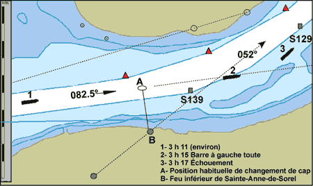 En dépassant Sorel, le navire fait route, cap sur les feux d'alignement de l'île du Moine, au 082,5°V. Les feux sont vus par-delà l'avant; le timonier gouverne au 084 °G conformément aux ordres du pilote. L'erreur gyro rapportée est de 1,5° haut, et le courant du fleuve porte environ au 090 °V à 2 noeuds. Avec l'allure en avant toute et le courant du fleuve donnant presque de l'arrière, la vitesse sur le fond se situe entre 15 et 15,5 noeudsNote de bas de page 5.