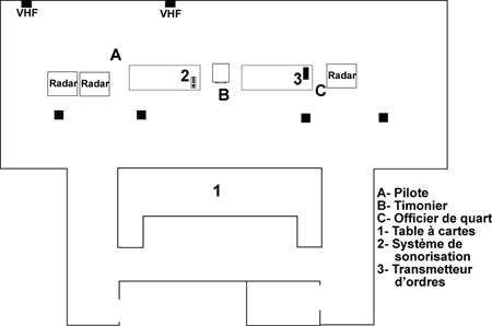 Aménagement de la passerelle et position des membres de l'équipe à la passerelle avant l'échouement