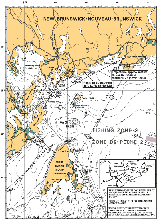 Le matin du 23 janvier 2004, le petit bateau de pêche Lo-Da-Kash, avec quatre personnes à bord, appareille de la baie Maces (Nouveau-Brunswick) pour un court voyage jusqu'à l'île Campobello dans la baie de Fundy (Nouveau-Brunswick) (voir l'annexe A). Le but du voyage de 21 milles marins est d'embarquer deux dragues à oursins à l'île Campobello puis de revenir à la baie Maces le même jour. Environnement Canada prévoit une température de −10°C et des vents d'ouest-nord-ouest de 20 à 25 noeuds accompagnés d'embruns verglaçants. La température de l'eau est d'environ 4 °C. Durant le trajet vers l'île Campobello, le Lo-Da-Kash fait route vers l'ouest-sud-ouest et il connaît une accumulation de glace.