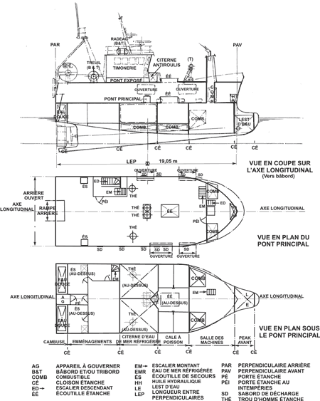 | Emplacement des treuils de chalut | Pont exposé | Pont principal |