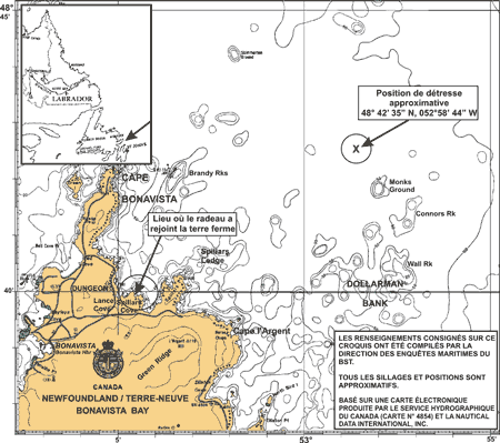Le bateau reste engagé après s'être incliné de quelque 80° sur bâbord. La machine principale s'arrête lorsque l'hélice se retrouve hors de l'eau. À 18 h 35, l'équipage réussit à lancer un message de détresse au centre des Services de communications et de trafic maritimes (SCTM) de St. Anthony. Un radeau pneumatique à huit places est mis à l'eau. L'équipage abandonne le navire sans encombre, mais sans emporter la radiobalise de localisation des sinistres de classe I qui est montée du côté bâbord du mât principal au-dessus de la timonerie; toutefois, la radiobalise se déclenche automatiquement. À 18 h 45, le radeau pneumatique est dégagé du bateau.