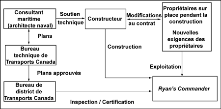 Le 15 janvier 2004, le plan d'ensemble du Ryan's Commander a été approuvé tel qu'il avait été soumis, sous réserve de notes inscrites en rouge par le bureau technique de Transports Canada à St. John's. Des copies approuvées de ce plan ont été envoyées à l'architecte naval, à l'administration centrale de Transports Canada à Ottawa (Ontario) pour archivage et au bureau de district de Transports Canada à Lewisporte (Terre-Neuve-et-Labrador), une copie étant conservée par le bureau de St. John's. L'architecte naval a ensuite transmis ce plan avec une lettre d'accompagnement au constructeur. Au jour de l'accident, Transports Canada n'avait pas renvoyé le plan de la citerne antiroulis à l'architecte naval. Le diagramme ci-après présente les relations (contractuelles et autres) entre les propriétaires, le constructeur, l'architecte naval et Transports Canada.
