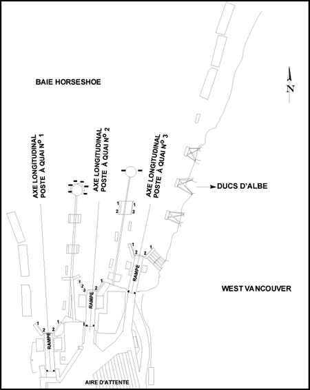Le Queen of Surrey amarre le côté tribord au poste à quai no 3 (voir la figure 2) dans ce qui semble être un accostage en douceur; aucun impact n'est ressenti durant l'approche du poste à quai ou pendant l'accostage. À l'arrivée, après avoir consulté le chef mécanicien, le capitaine décide de retenir les services du remorqueur pour le prochain accostage à la baie Horseshoe, prévu à 9 h. Lors de la communication avec le Cates V pour transmettre cette demande, le capitaine du remorqueur informe le traversier que le Cates V a subi des avaries aux fenêtres de la passerelle et à la timonerie et qu'il faudrait faire appel à un autre remorqueur.