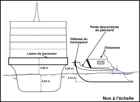 Comme l'illustre la figure 3, l'emplacement du liston du Queen of Surrey, le franc-bord du remorqueur et la pente du plat-bord rendaient la superstructure vulnérable à des avaries le long du traversier.