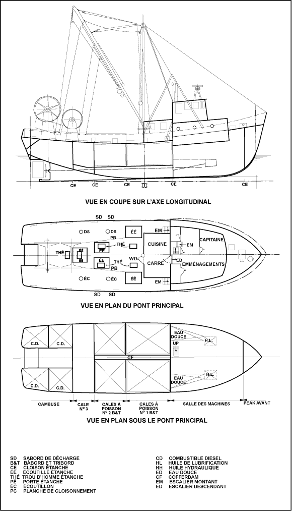 Le pont de pêche était recouvert d'un caillebotis en bois. Pour faciliter le chargement du poisson, deux planches de cloisonnementNote de bas de page 3, d'une hauteur de 91 cm (3 pi), étaient placées longitudinalement au-dessus du caillebotis. À l'arrière des emménagements, l'accès aux compartiments sous le pont se faisait par des panneaux d'écoutille ainsi que par des trous d'homme aménagés dans le panneau d'écoutille et le pont de pêche (voir la figure 1). Des écoutillons de chargement du poisson étaient aussi aménagés dans le bordé du pont à l'extérieur des écoutilles à hauteur des cales no 2 et de la cale no 3. Des sabords de décharge étaient situés dans les pavois.