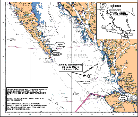 Le 17 février 2004, le chalutier Hope Bay est ravitaillé à Port Hardy (Colombie-Britannique). Cinq jours plus tard, le 22 février, 16 tonnes de glace sont chargées dans les cales à poisson et, vers minuit, le bateau prend la route des lieux de pêche dans le détroit de la Reine-Charlotte. Les réservoirs de carburant diesel et les citernes d'eau douce sont presque pleins, et il y a quatre personnes à bord : le patron, le second, le mécanicien et un observateur des pêches mandaté par le ministère des Pêches et des Océans.