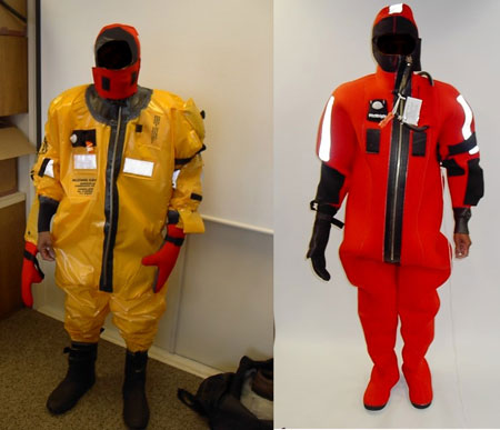 Deux membres d'équipage et l'observateur des pêches ont enfilé une combinaison d'immersion fournie par leur employeur. La photo 3 illustre les deux types de combinaisons portées. L'observateur des pêches, qui portait une combinaison d'un modèle plus récent (à gauche dans la photo), a été récupéré après avoir été immergé trois heures dans l'eau froide. Ses sous-vêtements étaient mouillés jusqu'à la taille, mais il avait encore chaud.