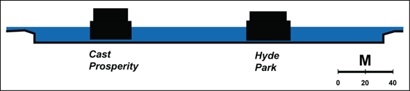 Le Cast Prosperity a tenté de rattraper le Hyde Park entre les bouées S-31/S-32 et S-43/S-44. Dans cette zone, le chenal navigable a 11,3 m de profondeur et 250 m de largeur. À l'extérieur du chenal, l'eau est très peu profonde, la ligne bathymétrique des 5 m avoisinant le bord du chenal à la hauteur des bouées S-43/S-44 (voir Figure 4).