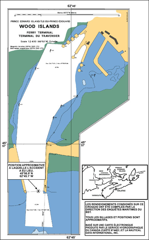 Le 27 juin 2005, vers 16 h 20, heure avancée de l'AtlantiqueNote de bas de page 2, le transbordeur roulier Confederation part de Caribou (Nouvelle-Écosse) et entreprend sa dernière traversée de la journée à destination de Wood Islands (Î.-P.-É.). Le vent souffle de l'est à 10 noeuds et soulève des rides à la surface de l'eau. Deux membres de l'équipage de la salle des machines font l'entretien d'une pièce d'équipement de cette salle. Peu de temps avant que le navire arrive dans les parages du terminal du traversier, un des membres de l'équipage quitte la salle des machines pour aller chercher une pièce dont il a besoin pour terminer le travail.