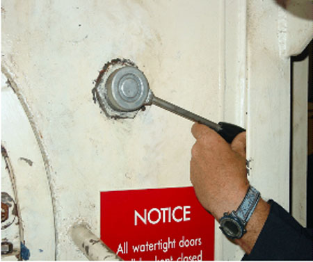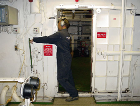 Chaque fois que le navire est en transit, les trois portes étanches sont commandées et fermées automatiquement à partir du poste de commande central de la passerelle. Il est possible d'actionner les portes à l'aide de la commande locale, mais la porte reste ouverte seulement pendant qu'on tient le levier de manoeuvre à la position ouverte. Dès qu'on relâche le levier, la porte se ferme.