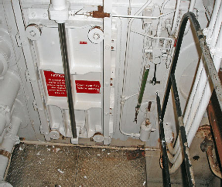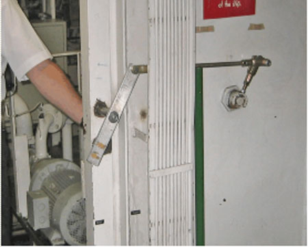 Dans le cas des deux portes étanches verticales à glissières, l'axe de rotation des leviers était plus rapproché du rebord de la porte, soit à 37 cm. Toutefois, la présence d'une cornière gênait l'accès à un des leviers de manoeuvre des deux portes (voir la photo 6). En outre, le sens de fonctionnement des leviers n'était pas le même pour les deux portes. Dans un cas, il fallait pousser le levier pour ouvrir la porte, alors que pour la seconde porte, il fallait tirer le levier vers soi pour ouvrir.