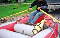 Les passagers s'assoient sur le tube de flottaison principal, des côtés gauche et droit, les jambes vers l'intérieur du radeau. Ils calent les pieds dans l'espace compris entre le fond, les tubes transversaux et le tube principal.