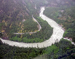 La rivière Elaho est une rivière d'envergure moyenne, alimentée par des glaciers, qui est située dans la chaîne Côtière de la Colombie-Britannique à environ 60 km au nord-ouest de Squamish (Colombie-Britannique). La turbulence de la rivière varie d'un jour à l'autre en fonction des précipitations de pluieNote de bas de page 2 et du taux d'écoulement glaciaire, lequel dépend de l'ensoleillement et de la température. Les positions des obstacles submergés (rochers, souches et rondins) varient en fonction du niveau d'eau de la rivière.
