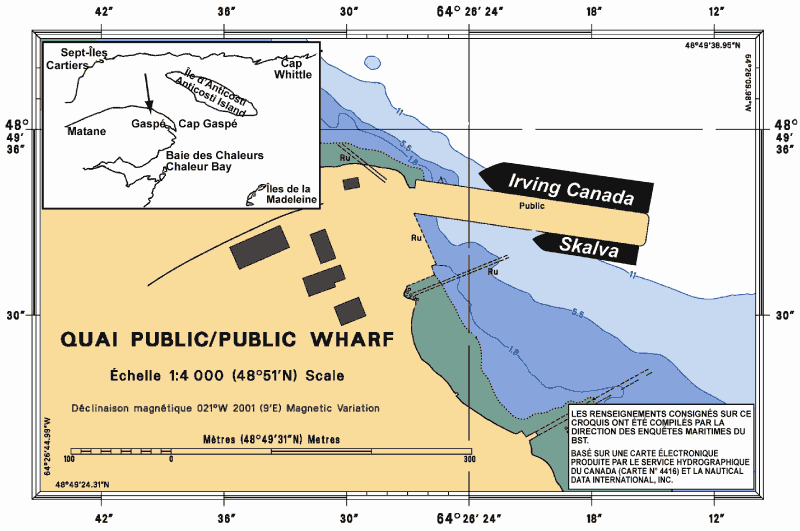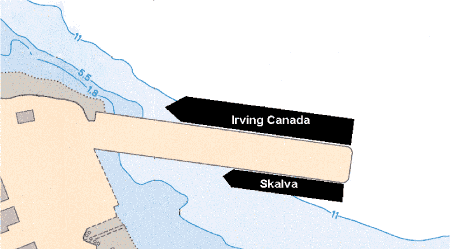 Durant la période de refroidissement du 4 au 11 janvier 2006, alors que les panneaux de cale étaient maintenus fermés après que le CO2 a été relâché dans la cale, le pétrolier Irving Canada arrive au port pour livrer une cargaison d'essence et de carburant diesel. Le 6 janvier 2006, le pétrolier Irving Canada demande à s'amarrer du côté nord du quai public, à 35 m du Skalva amarré côté sud, mais sa demande est refusée par Exploitation des ports de Transports Canada en consultation avec la Direction de la sécurité maritime de Transports Canada.
